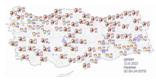 12 Haziran'da 26 şehre sarı kodlu uyarıda bulunuldu.