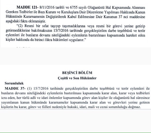 696 sayılı KHK ile Olağanüstü hal uygulamalarının uygulanmasına ilişkin 8 Kasım 2016'da çıkarılan yasanın 37. maddesine ek yapıldı. Bu maddeye bir 'fıkra' ekleyerek şöyle denildi: