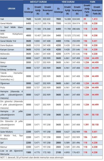 Böylelikle Kamu bürokrasisindeki hiyerarşi ve adalet gözetilerek, ek gösterge sisteminde yeni bir dönem başlayacak ve kamu görevlilerinin emekli aylıkları ile ikramiyeleri esaslı artacak.