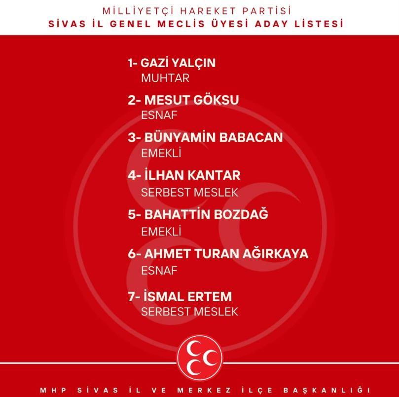 İşte MHP'nin Sivas İl Genel Meclisi ve Belediye Meclisi aday listesi;