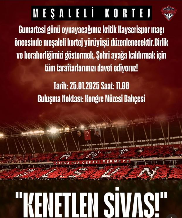 Cumartesi günü oynanacak kritik Kayserispor maçı öncesinde Sivasspor taraftarlarını bir araya getirmek ve birlik-beraberlik mesajı vermek amacıyla “Meşaleli Kortej” düzenlenecek.