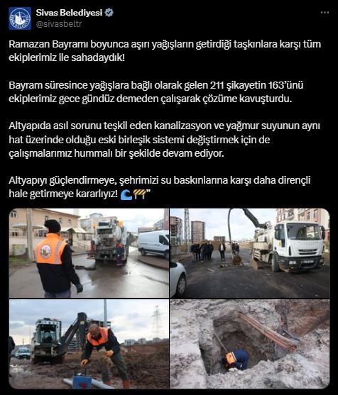 Ramazan Bayramı boyunca etkili olan sağanak yağışlara karşı tüm ekiplerin sahada görev başında olduğunu belirten yetkililer, vatandaşlardan gelen toplam 211 şikayetin 163’ünün gece gündüz demeden yapılan çalışmalarla çözüme kavuşturulduğunu açıkladı.