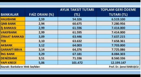 Başkent Üniversitesi Uluslararası Finans ve Bankacılık Bölüm Başkanı Prof. Dr. Şenol Babuşcu'nun paylaştığı güncel verilere göre, bankalar arasında konut kredisi faiz oranlarında büyük farklılıklar bulunuyor. Buna göre: