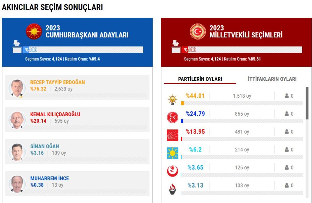 Akıncılar ilçesinde yapılan seçim sonuçlarına göre;