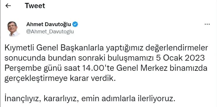 Davutoğlu, sosyal medya hesabından yaptığı açıklamada, "Yaptığımız değerlendirmeler sonucunda bundan sonraki buluşmamızı 5 Ocak 2023 Perşembe günü saat 14.00'te Genel Merkez binamızda gerçekleştirmeye karar verdik. İnançlıyız, kararlıyız, emin adımlarla ilerliyoruz" ifadelerini kullandı.