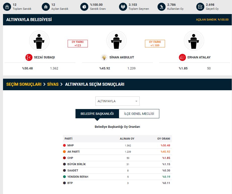 İşte 31 Mart 2024 Yerel Seçimlerinde Altınyayla İlçesinin Başkanlık seçim sonuçları..