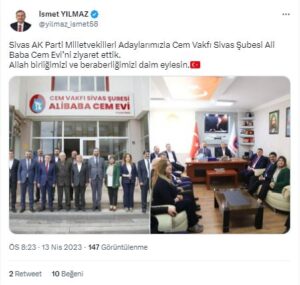 İsmet Yılmaz sosyal medya hesabından yaptığı paylaşımda: "Sivas AK Parti Milletvekilleri Adaylarımızla Cem Vakfı Sivas Şubesi Ali Baba Cem Evi’ni ziyaret ettik.