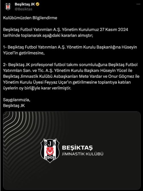 Beşiktaş Futbol Yatırımları A.Ş. Yönetim Kurulumuz 27 Kasım 2024 tarihinde toplanarak aşağıdaki kararları almıştır;