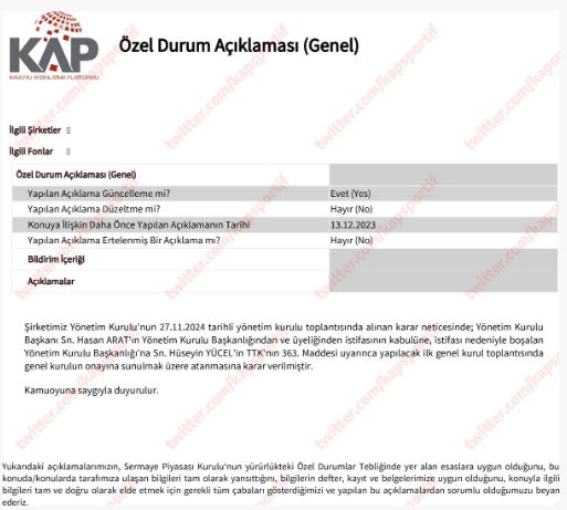 Yönetim Kurulu Başkanı Hasan Arat'ın Yönetim Kurulu Başkanlığından ve üyeliğinden istifasının kabulüne, istifası nedeniyle boşalan Yönetim Kurulu Başkanlığı'na Hüseyin Yücel'in TTK'nın 363. maddesi uyarınca yapılacak ilk genel kurul toplantısında genel kurulun onayına sunulmak üzere atanmasına karar verilmiştir.