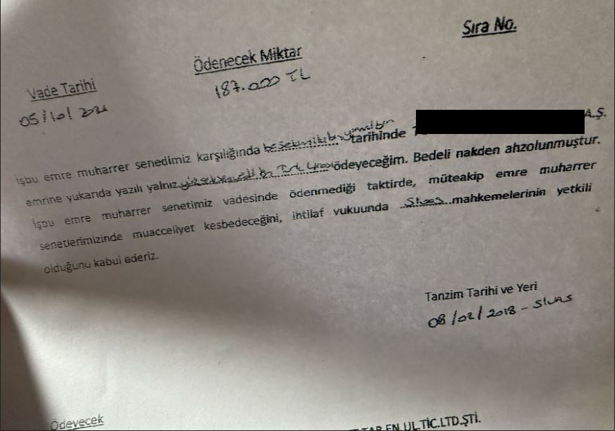 “Vadeli borç senedi... tutar: 187.000 TL... borçlu ve kefil: (Firma sahibi ve babası S.M.)”
