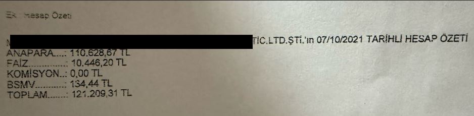 2021 yılının Ekim ayında, banka tarafından gönderilen resmi ihtarnamede, kredinin kalan ana borcunun 110 bin TL, buna eklenen faiz ve masraflarla birlikte toplam 121 bin TL olduğu ifade edilerek, bu borcun ödenmesi talep edildi.