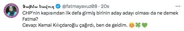 CHP'li bazı hesaplar tarafından da aday adayı olması eleştirilen Yavuz, hakkında yazılanlara da, "CHP'nin kapısından ilk defa girmiş birinin aday adayı olması da ne demek Fatma? Cevap: Kemal Kılıçdaroğlu çağırdı, ben de geldim." yanıtını verdi.