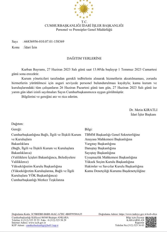 Cumhurbaşkanlığı İdari İşler Başkanlığı tarafından yayınlanan yazı ile Kurban Bayramı tatili resme 9 gün oldu. (Halil Yavuz Canpolat)