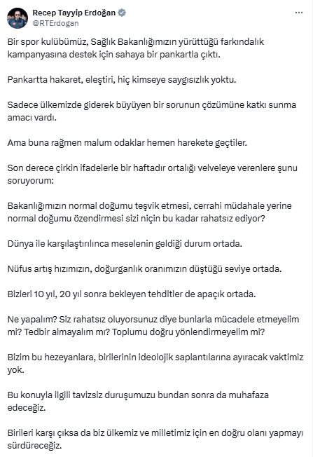Geçtiğimiz hafta Trendyol Süper Lig karşılaşmasına çıkarken “Doğal olan normal doğumdur” yazılı pankartla sahaya çıkan Sivasspor, bazı çevrelerce eleştirilmiş, konu sosyal medyada geniş yankı uyandırmıştı. Tartışmalar üzerine açıklama yapan Cumhurbaşkanı Recep Tayyip Erdoğan, hem mitingde hem de sosyal medya hesabından pankarta sahip çıktı.