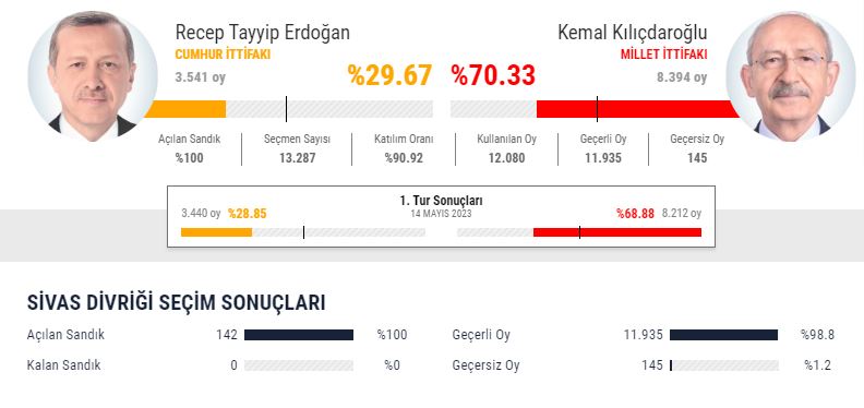 İşte 28 Mayıs 2023 Cumhurbaşkanlığı Seçimlerinde Divriği ilçesinden gelen sonuçlar: (Devrim Esra Dündar)