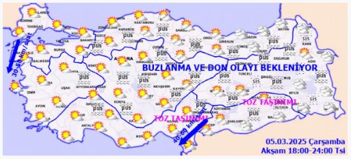Sabah ve gece saatlerinde iç ve doğu kesimlerde buzlanma ve don olayıyla birlikte pus ve yer yer sis bekleniyor. Doğu Karadeniz’in iç kesimleri ile Doğu Anadolu’nun yüksek ve dik yamaçlarında çığ tehlikesi bulunuyor.