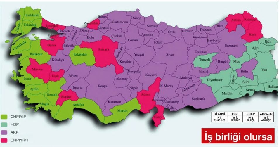 İkinci harita “CHP-İYİ Parti ittifakı yapılarak seçime girilirse ne olur”a yanıt veriyor. Bu haritaya göre; İYİ Parti yedi il, 55-85 ilçede, CHP 18 il 189 ilçede, AK Parti-MHP 46 il 620 ilçede, HEDEP 10 il 80 ilçede belediye başkanlığı kazanıyor. Toplamda CHP-İYİ Parti 25 il ve 260’a yakın ilçede ipi göğüslüyor.