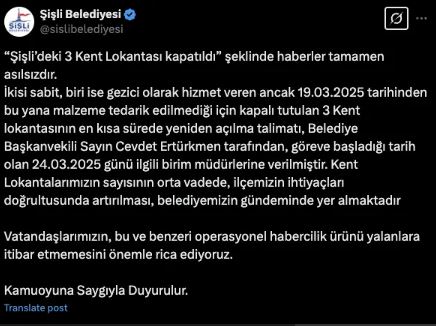 “'Şişli’deki 3 Kent Lokantası kapatıldı' şeklinde haberler tamamen asılsızdır. İkisi sabit, biri gezici olan üç Kent Lokantası, 19.03.2025 tarihinden bu yana malzeme tedarikindeki aksaklık nedeniyle geçici olarak hizmet verememiştir. Belediye Başkanvekili Sayın Cevdet Ertürkmen’in göreve başladığı 24.03.2025 tarihinde ilgili birim müdürlerine, lokantaların en kısa sürede yeniden açılması talimatı verilmiştir.”