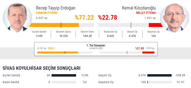 İşte 28 Mayıs 2023 Cumhurbaşkanlığı Seçimlerinde Koyulhisar ilçesinden gelen sonuçlar: (Devrim Esra Dündar)