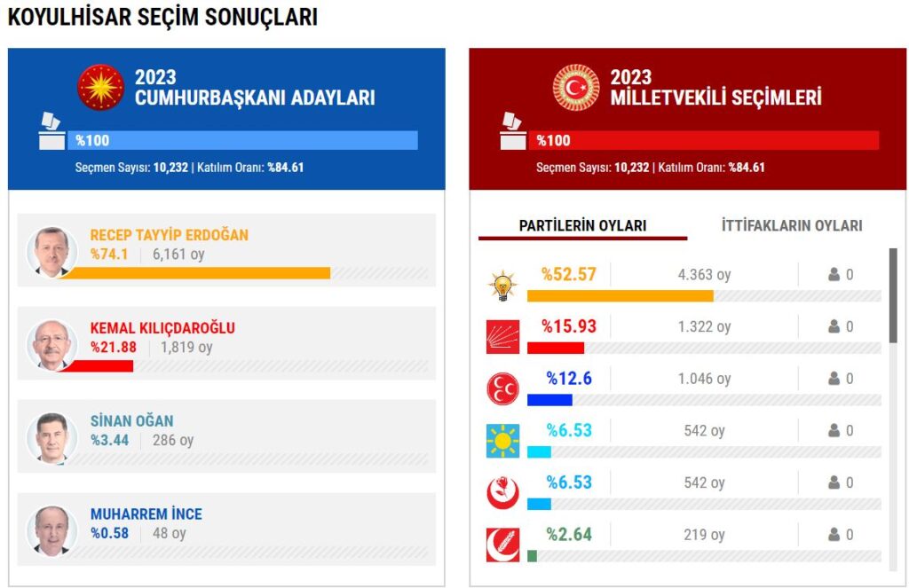Koyulhisar ilçesinde yapılan seçim sonuçlarına göre;