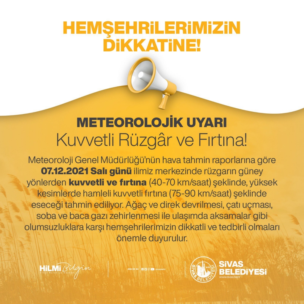 Sivas Belediyesi tarafından yapılan açıklamada Meteoroloji Genel Müdürlüğü hava tahmin raporlarına göre 07.12.2021 Salı günü ilimiz merkezinde kuvvetli rüzgar ve fırtına görülmesi bekleniyor.