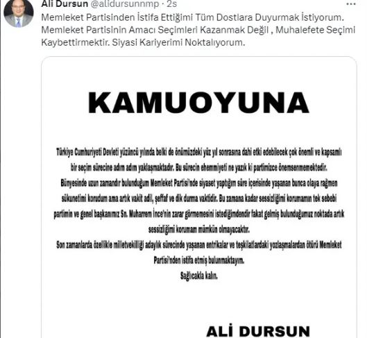 Dursun, Twitter hesabından yaptığı paylaşımda, "Memleket Partisi'nden istifa ettiğimi tüm dostlara duyurmak İstiyorum. Memleket Partisi'nin amacı seçimleri kazanmak değil, muhalefete seçimi kaybettirmektir. Siyasi kariyerimi noktalıyorum" ifadesini kullandı. Dursun, şunları kaydetti: