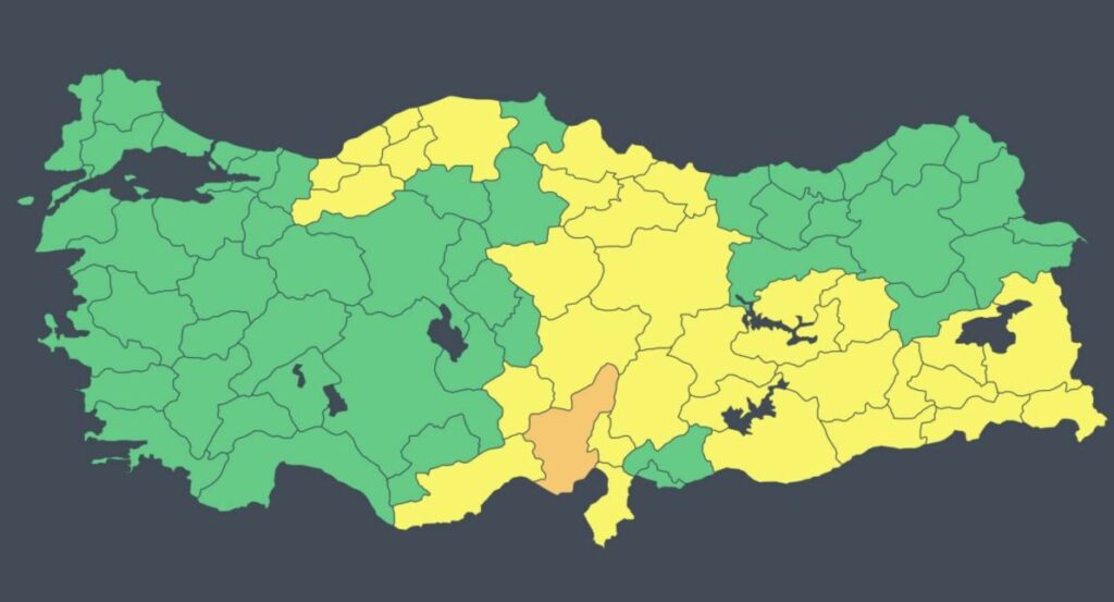 Adana turuncu kod ile uyarılırken, Amasya, Bingöl, Bitlis, Bolu, Diyarbakır, Elazığ, Hakkari, Hatay, Mersin, Kastamonuı, Kayseri, Malatya, Kahramanmaraş, Mardin, Niğde, Ordu, Samsun, Siirt, Sivas, Tokat, Tunceli, Şanlıurfa, Van, Yozgat, Zonguldak, Batman, Şırnak, Bartın, Karabük, Osmaniye, Düzce için sarı kod uyarısı yapıldı.-ensonhaber