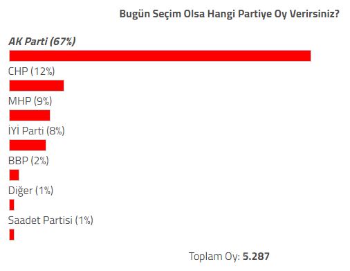 5287 kişinin verdiği oylara göre, AK Parti (67%), CHP (12%), MHP (9%), İYİ Parti (8%), BBP (2%), Saadet Partisi (1%), Diğer (1%) oranında oy alıyor.