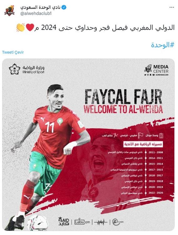 DG Sivasspor’da sözleşmesi sona eren Fayçal Fajr, Suudi Arabistan kulüplerinden Al-Wahda Mekka ile 2 yıllık sözleşme imzaladı.
