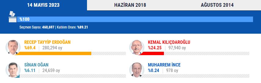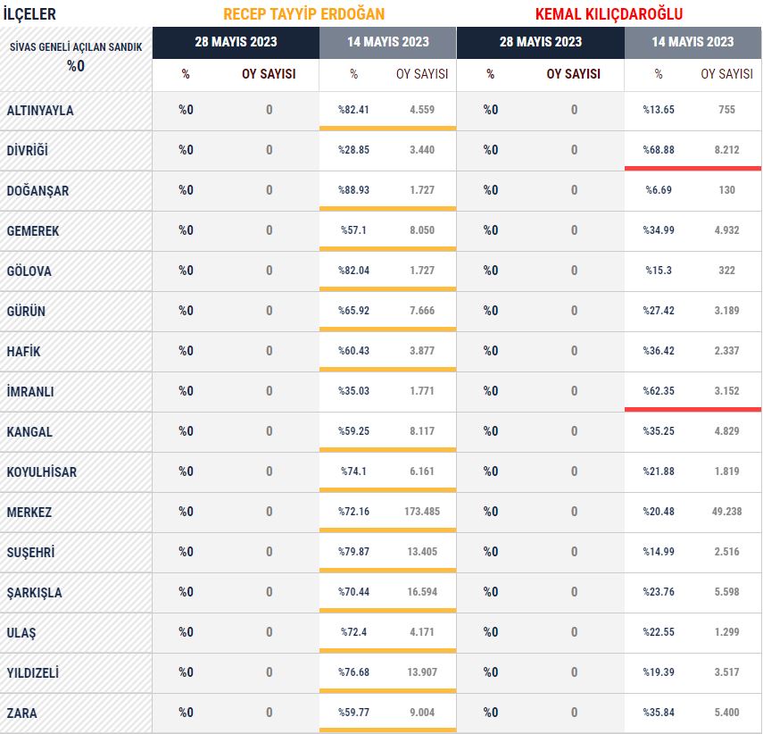 Sivas merkez ve ilçelerinde 14 Mayıs tarihinde yapılan Cumhurbaşkanlığı seçimlerinde alınan oylar ise şöyle; (Şeref Gülmez)