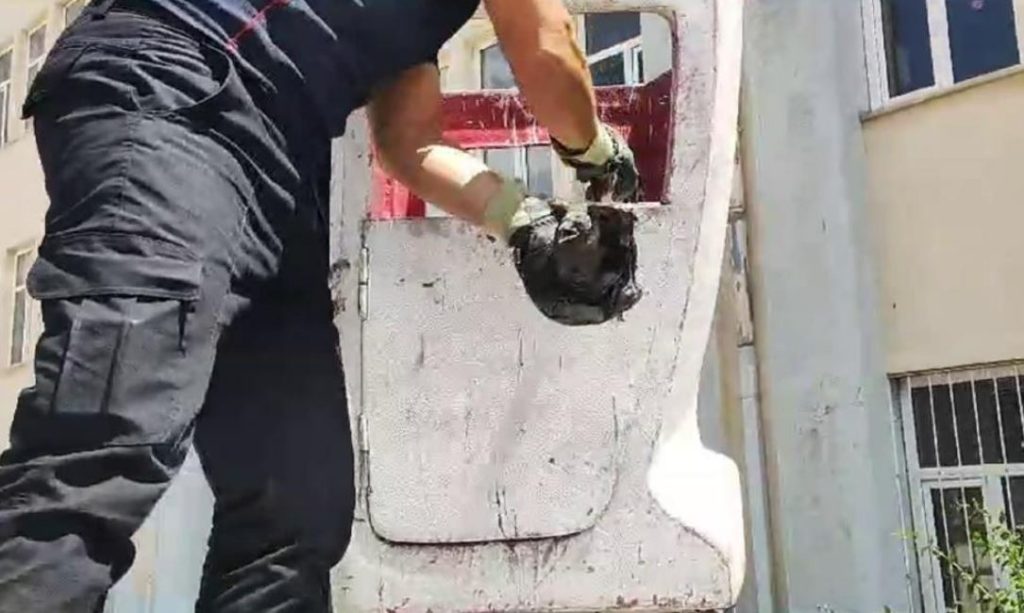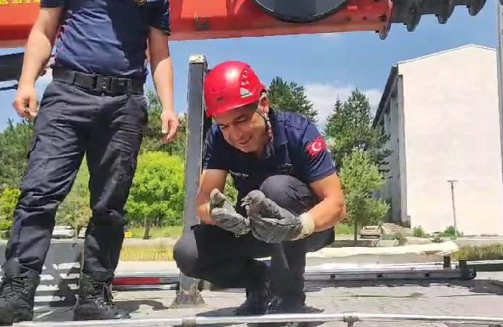 Sivas’ta bir binanın çatı kısmında ayağı ipe dolanan karga itfaiye ekiplerince kurtarıldı.