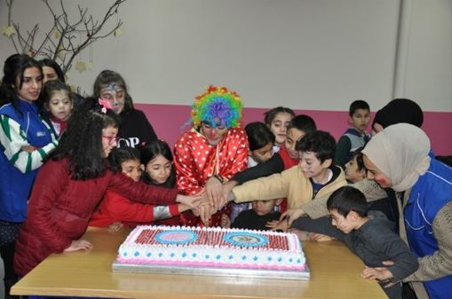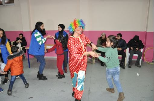 Fen lisesindeki çok amaçlı salonda düzenlenen etkinlikte öğrenciler, palyaçolar eşliğinde oyun oynayıp eğlendi.