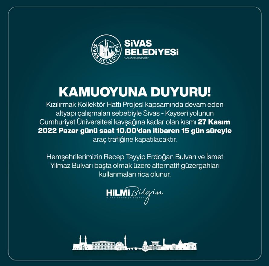 Yapılan açıklamada: "Kızılırmak Kollektör Hattı Projesi kapsamında devam eden altyapı çalışmaları sebebiyle Sivas-Kayseri yolunun Cumhuriyet Üniversitesi kavşağına kadar olan kısmı 27 Kasım 2022 Pazar günü saat 10:00'dan itibaren 15 gün süreyle araç trafiğine kapatılacaktır." ifadelerine yer verildi.