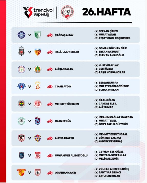 Trendyol Süper Lig'de 26. hafta karşılaşmalarını yönetecek hakemler Türkiye Futbol Federasyonu tarafından açıklandı.