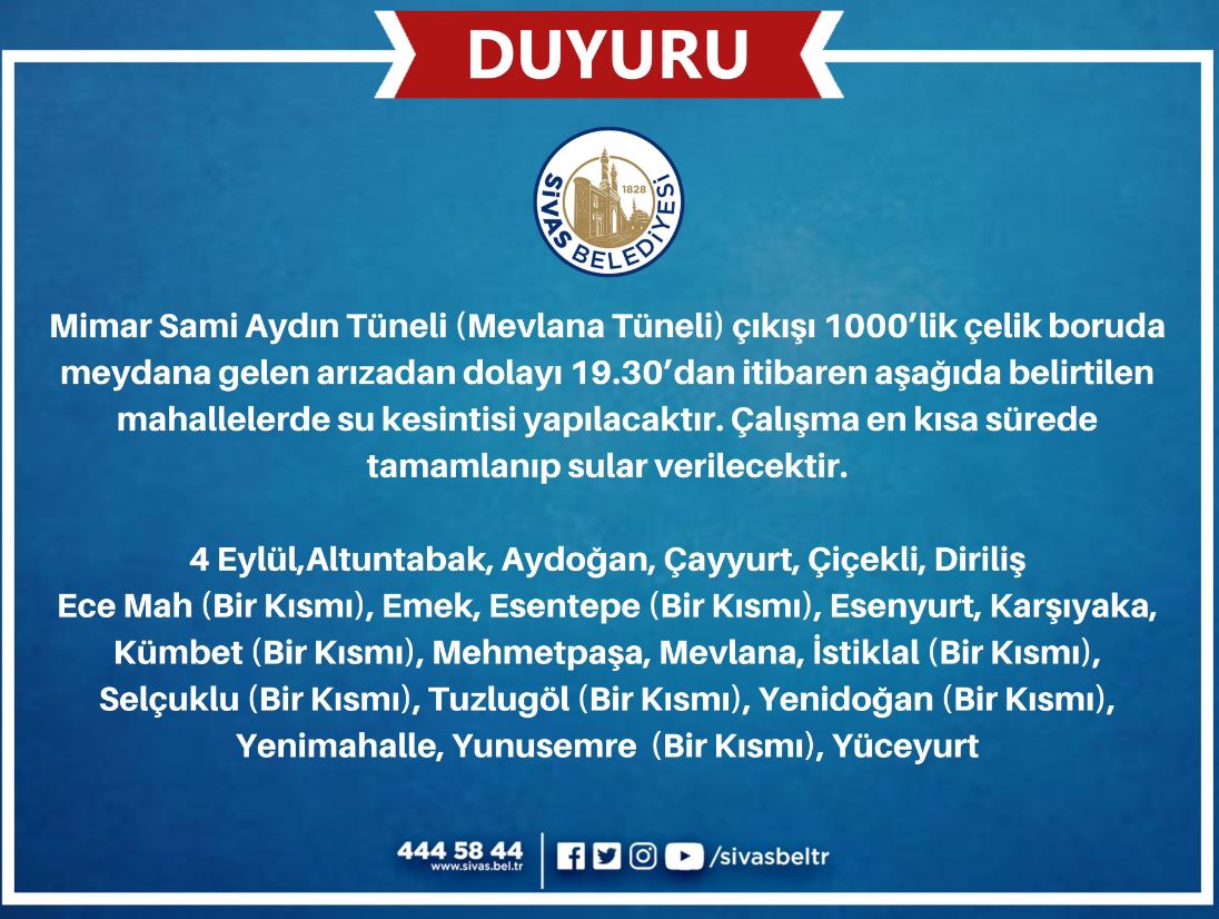 Sivas Belediyesi sosyal medya hesabından bir açıklama yapılarak suların kesileceği duyuruldu.
