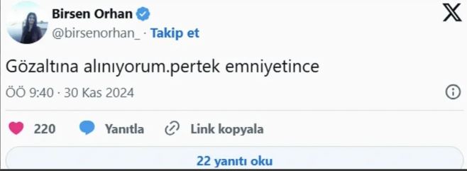 İçişleri Bakanlığı tarafından 22 Kasım’da kayyum atanan DEM Partili Tunceli Belediyesi Eşbaşkanı Birsen Orhan, X hesabındaki paylaşımla gözaltına alındığını duyurdu.