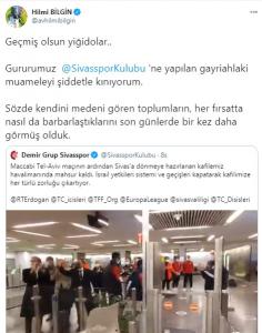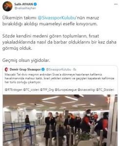 Vali Salih Ayhan, sosyal medya hesabından Sivasspor’un havalimanındaki görüntüsünü paylaşarak, "Ülkemizin takımı Sivasspor Kulübü’nün maruz bırakıldığı akıl dışı muameleyi esefle kınıyorum. Sözde kendini medeni gören toplumların, fırsat yakaladıklarında nasıl da barbar olduklarını bir kez daha görmüş olduk. Geçmiş olsun Yiğidolar" notunu ekledi.