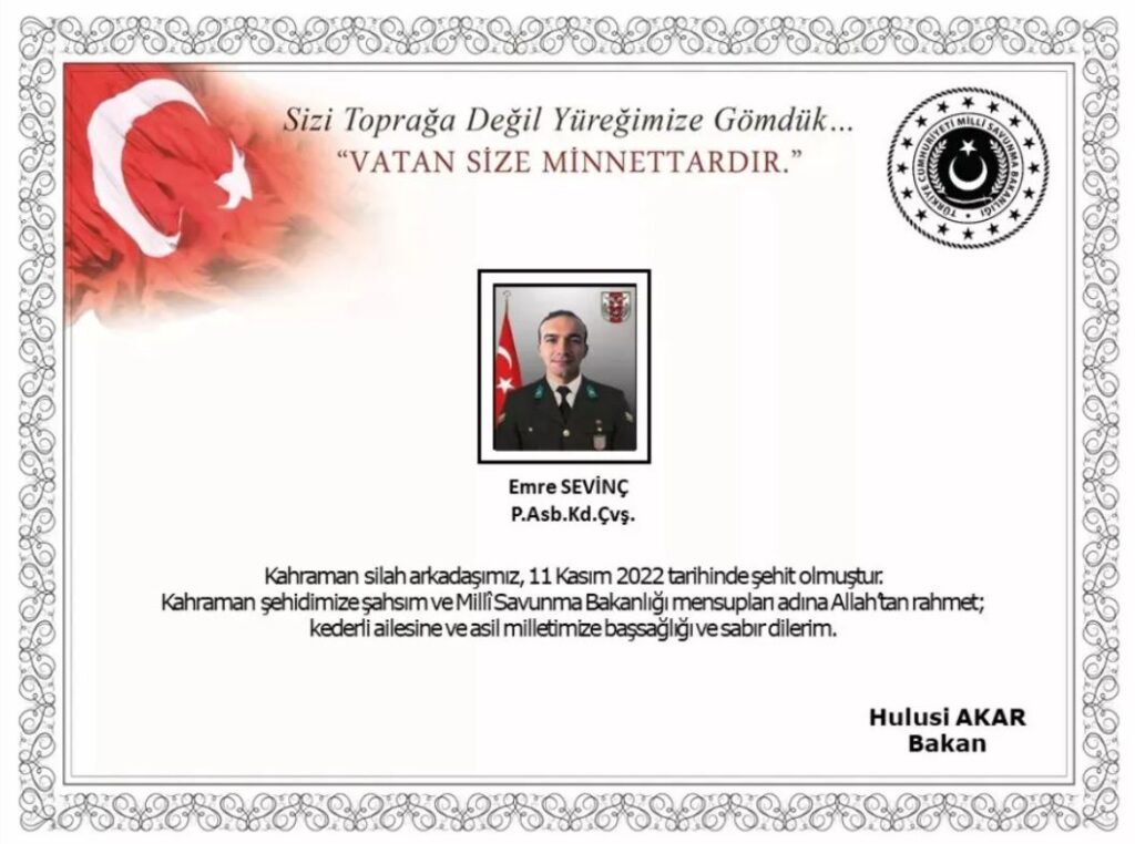 Milli Savunma Bakanlığı tarafından konu hakkında yapılan yazılı açıklamada, “Pençe-Kilit operasyonu bölgesinde, 11 Kasım 2022 tarihinde, bölücü terör örgütü mensupları tarafından açılan taciz ateşi sonucu, kahraman silah arkadaşımız Piyade Astsubay Kıdemli Çavuş Emre Sevinç yaralanmış, derhal hastaneye sevk edilmiş, yapılan tüm müdahalelere rağmen kurtarılamayarak şehit olmuştur. Bizleri derin bir acı ve üzüntüye boğan bu olayda hayatını kaybeden aziz şehidimize Allah’tan rahmet, kederli ailesine, Türk Silahlı Kuvvetleri ile asil milletimize başsağlığı ve sabır dileriz” ifadeleri yer aldı.-internethaber