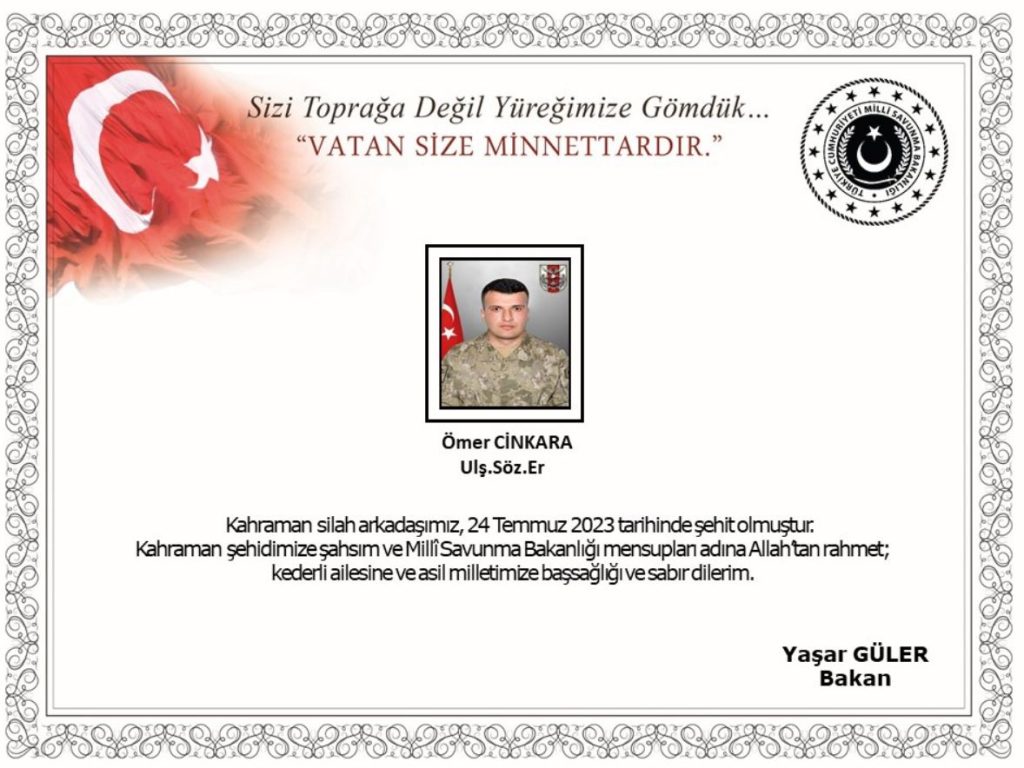 MSB: "Özalp/Van’da 24 Temmuz 2023 tarihinde silah kazası sonucu yaralanarak derhal hastaneye sevk edilen kahraman silah arkadaşımız Ulş.Söz.Er Ömer Cinkara yapılan tüm müdahalelere rağmen kurtarılamayarak şehit olmuştur. Bizleri derin bir acı ve üzüntüye boğan bu olayda hayatını kaybeden aziz şehidimize Allah’tan rahmet, kederli ailesine, Türk Silahlı Kuvvetleri ile asil milletimize başsağlığı ve sabır dileriz." (İHA)