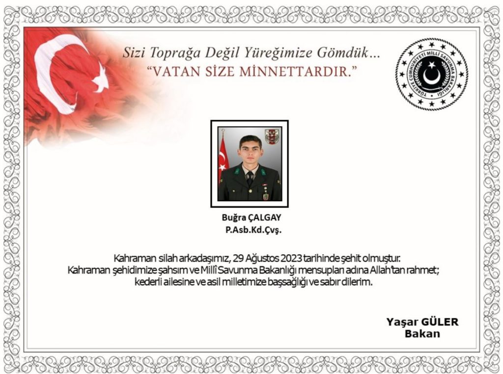 Pençe-Kilit operasyonu bölgesinde Piyade Astsubay Kıdemli Çavuş Buğra Çalgay askeri araç kazası sonucu ağır yaralandı. Hastaneye kaldırılan Çalgay yapılan tüm müdahalelere rağmen şehit oldu. Milli Savunma Bakanlığından yapılan açıklamada, “Bizleri derin bir acı ve üzüntüye boğan bu olayda hayatını kaybeden aziz şehidimize Allah’tan rahmet, kederli ailesine, Türk Silahlı Kuvvetleri ile asil milletimize başsağlığı ve sabır dileriz” ifadeleri kullanıldı. (İHA)