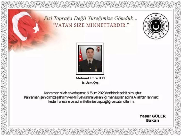 Milli Savunma Bakanlığı’ndan yapılan yazılı açıklamada, “Pençe-Kilit operasyon bölgesinde bir üs bölgemize 09 Ekim 2023 tarihinde bölücü terör örgütü mensuplarınca yapılan taciz atışı sonucu yaralanarak derhal hastaneye sevk edilen kahraman silah arkadaşımız İs. Uzm. Çvş. Mehmet Emre Teke yapılan tüm müdahalelere rağmen kurtarılamayarak şehit olmuştur. Bizleri derin bir acı ve üzüntüye boğan bu olayda hayatını kaybeden aziz şehidimize Allah’tan rahmet, kederli ailesine, Türk Silahlı Kuvvetleri ile asil milletimize başsağlığı ve sabır dileriz” ifadeleri kullanıldı. (İHA)