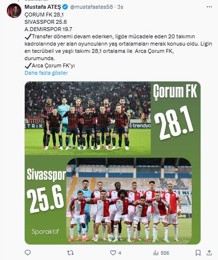 Sivas'ın duayen spor gazetecilerinden Mustafa Ateş'in sosyal medya hesabından paylaştığı bilgilerde Sivasspor 25.6 yaş ortalamasıyla listede yer aldı.