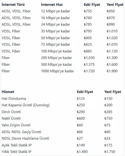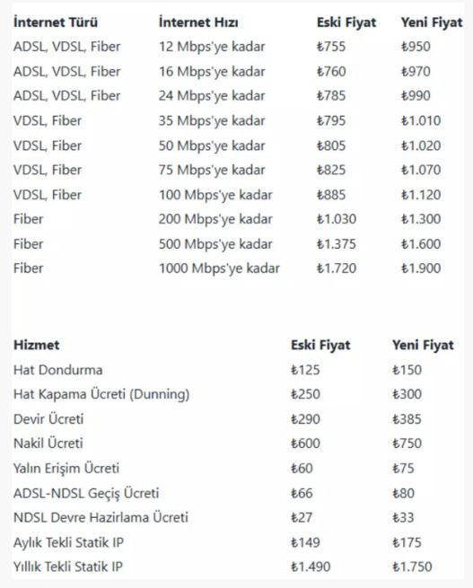 ADSL, VDSL ve Fiber internet abonelerini kapsayan zamlı tarifeler, 1 Temmuz 2025 tarihinden itibaren yürürlüğe girecek.