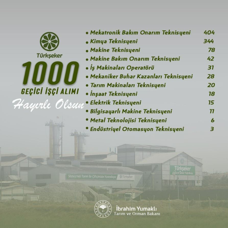 Bakan Yumaklı yaptığı paylaşımda : "Türkiye Şeker Fabrikaları A.Ş. bünyesindeki fabrikalarda istihdam edilmek üzere çeşitli branşlarda toplam 1000 geçici işçi alımı gerçekleştireceğiz.