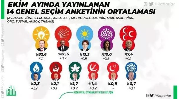 Ekim ayında araştırma şirketlerinin yapmış olduğu 14 seçim anketinin ortalaması alındı. Ortaya çıkan tabloda ittifaklar arasındaki rekabet dikkat çekti. Öte yandan bir parti gösterdiği yükselişle AK Parti'nin ardından ikinci sırada yer aldı.