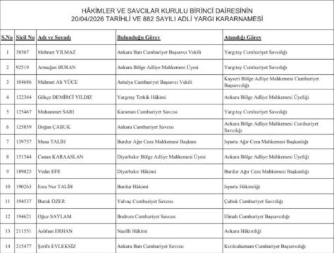 14 hakim ve savcının görev yeri değiştirildi.. Hakimler ve Savcılar Kurulu (HSK) Birinci Dairesi’nin 20 Nisan 2026 tarihli ve 882 sayılı adli yargı kararnamesi kapsamında 14 hakim ve savcının görev yerinde değişikliğe gidildi.
