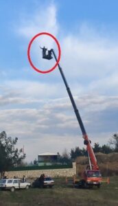 Olay, Nilüfer ilçesindeki Kayapa Göleti civarındaki piknik alanında meydana geldi. Birçok kişinin araç içerisinde alkol aldığı görülen bölgede, 10 metrelik vincin sepetine çıkan bir kişi, vinç en tepe noktasına çıktığında, çevredeki diğer alkol alan şahıslara "Komşular afiyet olsun" diyerek seslenip elindeki alkol şişesini gösterdi. Bu hareket üzerine diğer alkol alan kişiler de vinçteki kişiyi alkışlamaya başladı.