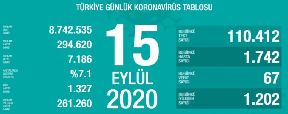 Maalesef korkutan açıklamalar gelmeye devam ediyor. Vaka ve ölüm sayıları her geçen gün daha da artıyor. Sağlık Bakanlığı tarafından 15 Eylül koronavirüs tablosu, vaka, test, vefat sayısı ve son durum açıklandı. Türkiye'de son 24 saatte 110 bin 412 Kovid-19 testi yapıldı, 1742 kişiye hastalık tanısı konuldu. Son 24 saatte 67 kişi Kovid-19 nedeniyle hayatını kaybetti, 1327 ağır hasta sayısı oldu.