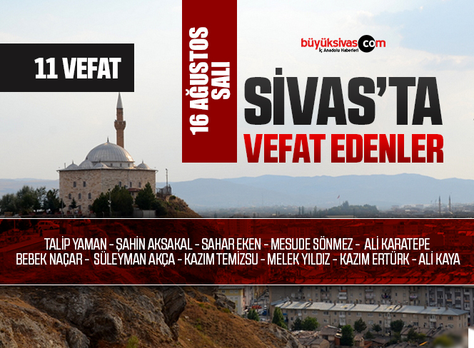 Sivas’ta 16 Ağustos 2022 tarihinde aramızdan ayrılanlar.. Hayatını kaybedenlere Büyük Sivas ailesi olarak Allah’tan rahmet, geride kalanlarına başsağlığı dileriz.