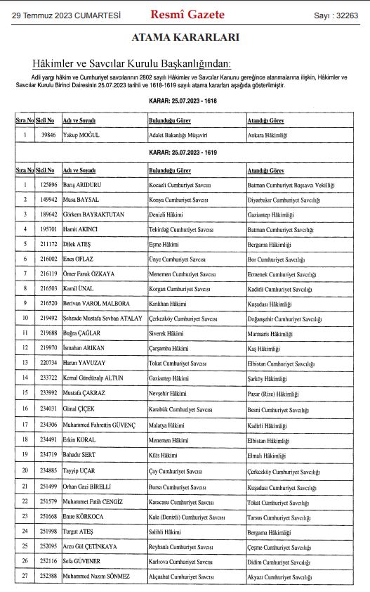 Hakimler ve Savcılar Kurulu'nun (HSK) adli ve idari yargıdaki atama kararnamesi Resmi Gazete'de yayımlanarak yürürlüğe girdi.